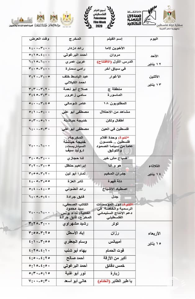 يتضمن جدول عروض الأفلام التي تبدأ من الثالثة عصرا يوميا وحتى السابعة مساءً كل من فيلم (تـوتـر) رشيد مشهراوي، (خمس دقائق) لأحمد البرغوثي، (قوت الحمام) لبهاء أبو شنب ، (أكبر من الأزقة) لأحمد صالح ، (جــدل) لفايق جرادة ، (رزان أثر الفراشة) إياد الأسطل ، (زيارة) نور أبو غنية ، (الأخوين لاما) رائد دزدار،(مروان) أحمد البرغوثي ، (في سياق آخر) رامي سمارة ـ معن ياسين ،(الأغوار) عبد الباسط خلف ـ أحمد كيلاني ، (اصطياد الأشباح) رائد أنضوني ، (فلسطين في العين) مصطفى أبو علي ، (جدران المخيم) تمارا أبو لبن ، (صباح مش خير) لنا حجازي ، (هو و أنا) إبراهيم حنظل ،(دلــة قهوة) ثائر العزة ،(المطلوبون 18) عامر شومالي ،(الماسورة) سامي زعرور، (مشاهد من الاحتلال في غزة) مصطفى أبو علي ، (أطفال ولكن) خديجة حباشنة ، (منطقة ج ) صلاح أبو نعمة ، (أمبيانس) وسام الجعفري ، ويشهد ختام الأسبوع عرض فيلم ( ياطير الطاير) لهاني أبو أسعد .
