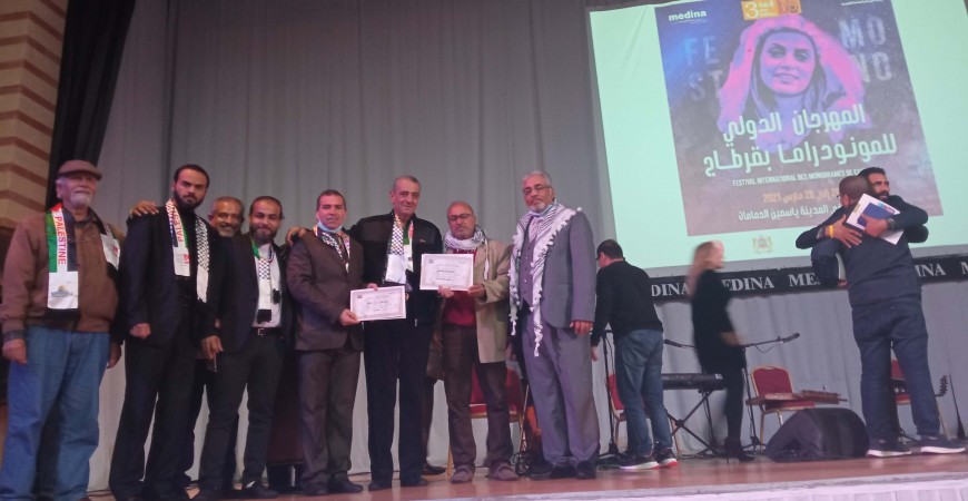 احتفى الاتحاد العام للمراكز الثقافية،باليوم العالمي للمسرح ،من خلال مشاركته بفعاليات الدورة الثالثة للمهرجان الدولي للمونودراما بقرطاج، بمسرحية مونودراما " صهيل " ،برائعه الكاتب العراقي سعد هدابي وإخراج أسامة مبارك الخالدي وأداء الفنان وليد أبو جياب وديكور وسينغرافيا الفنان إسماعيل دحلان،ومساعد مخرج محمود عفانة ،وإشراف عام الأستاذ يسري درويش، جاء ذلك في فعاليات المهرجان بقاعة القطب الثقافي ديار ياسمين بالحمامات وتخلل الحفل العديد من الفعاليات والفقرات الفنية ، واشتملت المشاركة على تكريم سفير اليونسكو للسلام الموسيقار العراقي نصير شمة، ضمن أربع شخصيات مسرحية عربية مهمة في مقدمتهم الكاتب والفنان المغربي عبد الكريم برشيد، والفنان الجزائري العمري كعوان، والفنان والمخرج الليبي شرح البال عبد الهادي. وحضور ومشاركة وفد من سفارة دولة فلسطين في تونس ممثلة بسعادة السفير السيد هايل الفاهوم .
