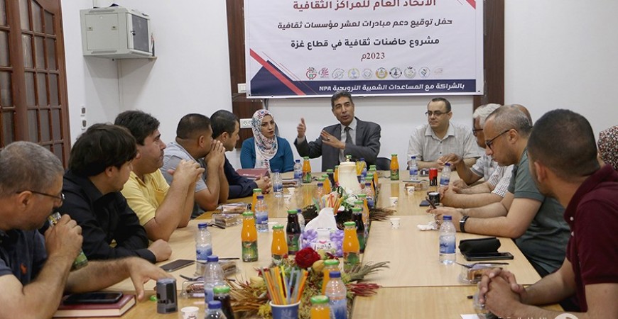 نظم الاتحاد العام للمراكز الثقافية حفل توقيع دعم مبادرات لعشر مؤسسات ثقافية من بين أعضائه حصلت على منحة مشروع "حاضنات ثقافية في قطاع غزة " والممول من المساعدات الشعبية النرويجية NPA.