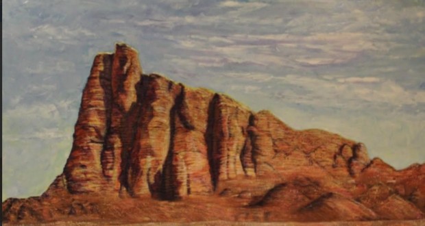 ومع ذلك، لا يوجد دليل تاريخي على قدسية المكان أو ارتباطه بعقيدة دينية، بل هو منظر طبيعي خلاب بكتل صخرية ضخمة نحتتها التعرية الجوية في قلب الصحراء، وهي تمتد على مساحات شاسعة. وقد أبرزت الفنانة في لوحتها انعكاس الشمس الذهبية على الصخور مع الظل الداكن وآثار التعرية الطبيعية، ومع انعكاس الشمس عليها سواء بالشروق أو الغروب نرى مشهدا ساحرا خلابا.